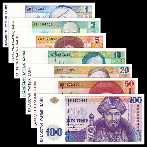 Banknote: Kazakhstan 7 Pcs Set, 1 3 5 10 20 50 100 Tenge, 1993, P-7 8 9 10 11 12 13, Unc