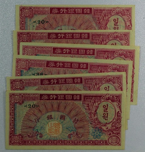 Banknote: Lot Of 6 Korea-South 1 Won Banknotes 1953 Au To Unc. {Do110B}