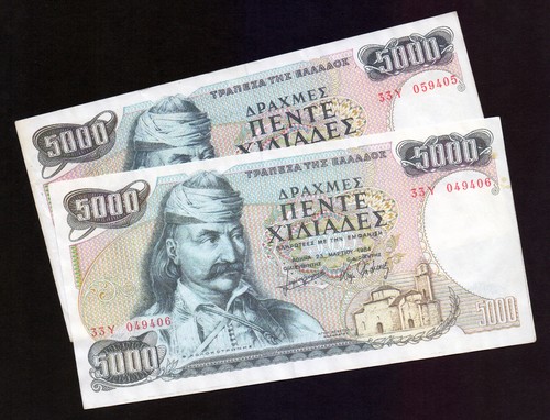 Rare!! 2 Pcs Counterfeit P#203 1984 Greece 5000 Drachma Banknotes