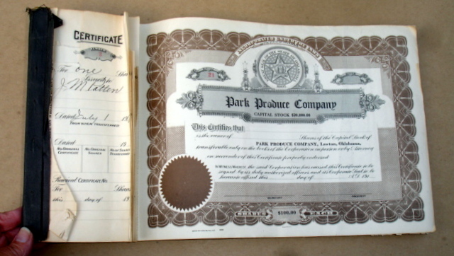 Stock/Bond: 1918 Stock Certificate Book~Park Produce Company~Lawton Oklahoma~Dairy Cows