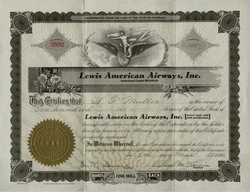 Stock/Bond: 1935 Lewis American Airways Stock Certificate Airomobile Flying Auto Prototype