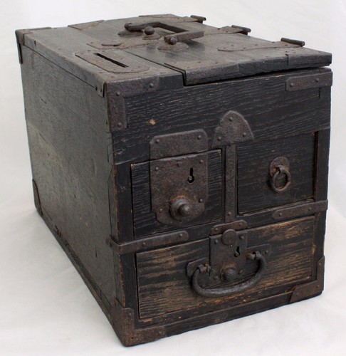 Antique Japanese Meiji Wood Iron Zenibako Money Box Coin Chest