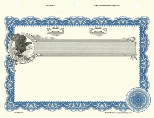 Stock/Bond: Blue Stocksmith Stock Certificates Blank - No Wording - 20 Qty