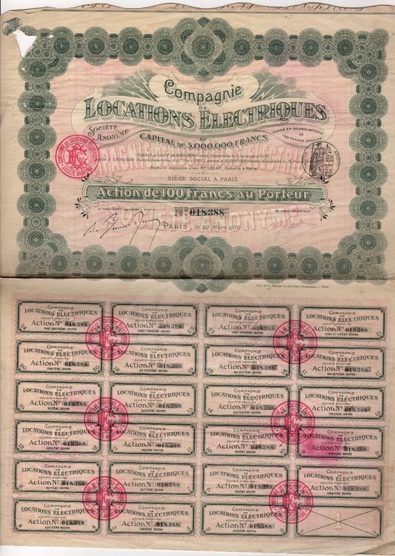 Stock/Bond: French Utilities Corporation Stock Certificate Societe Antonyme Electriques