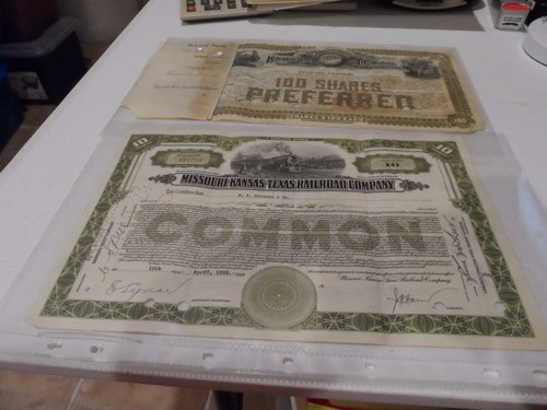 Two Missouri Kansas Texas Railroad Company Stock Certificates 10 And 100 Shares