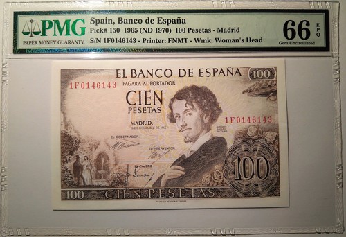 Banknote: •Q-B• Spain 100 Pesetas 1965 P 150 • Pmg Epq 66 Gem Unc • P150