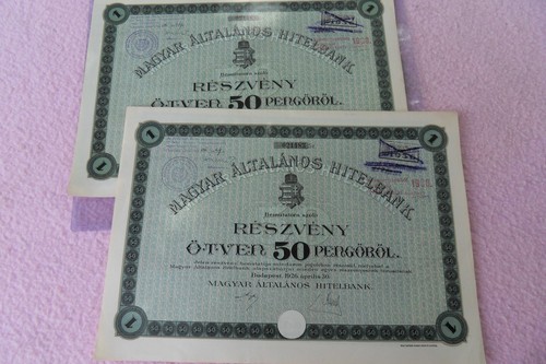 Stock/Bond: Hungary Bank Stock Certificates. Magyar Altalanos Hitelbank, 1926,50 Pengo, 2 Sh