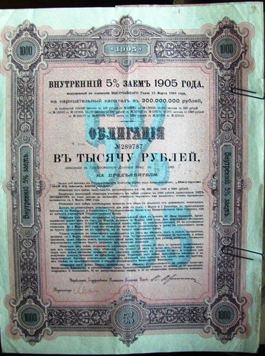 Russian Internal 5% Loan, 1905. 1000 Rubles Bond With Talon + Coupons