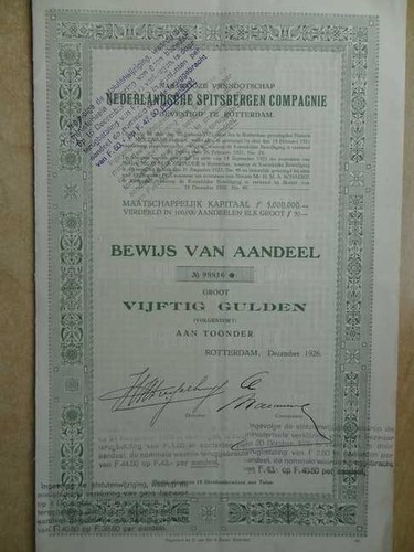 Spitsbergen:Nederlandsche Spitsbergen Comp. Aandeel 50 Gulden. Rotterdam 1926