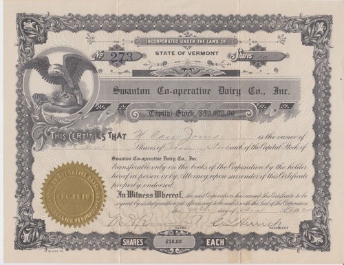 Stock/Bond: Swanton Co-Operative Dairy Co., Inc Stock Certificate, Vermont, 1920 10 Shares