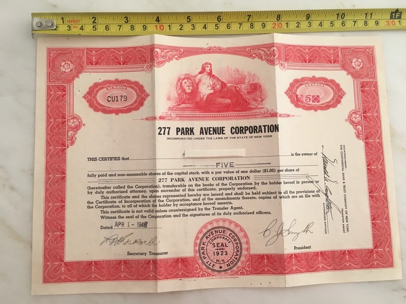Vintage 1940'S Park Avenue Stock Certificate 5 Shares
