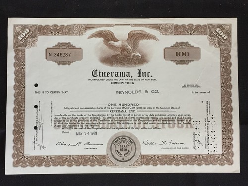 Stock/Bond: Vintage Stock Certificate Cinerama, Inc. With Eagle Vignette 1969