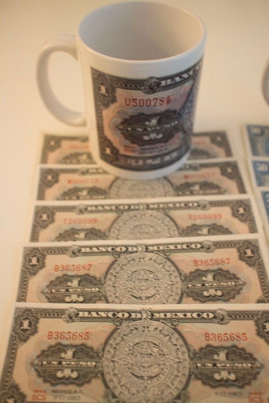 Banknote: Un Peso 11Oz Coffee Mug & 1 Pesos Paper Money Note Bill 1969-1972 Vntg