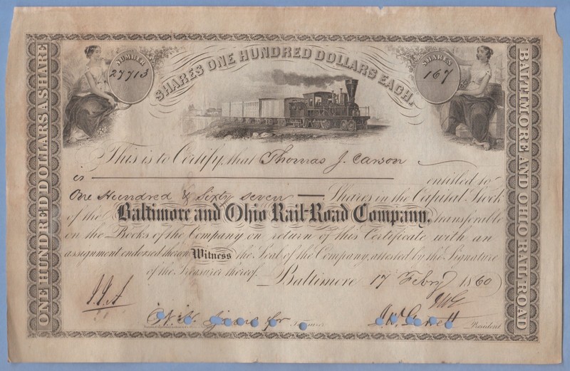 Stock/Bond: 1860 Stock Certificate Baltimore & Ohio Railway #27713 T J Carson 167 Shares