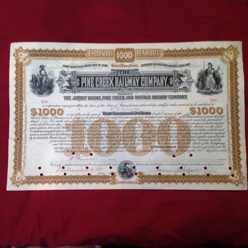 Stock/Bond: Antique 1885 Pine Creek Railway $1000 Bond , Large Railroad Stock Certificate