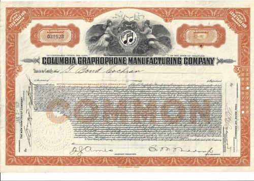 Stock/Bond: Columbia Graphophone Manufacturing Company....1921 Common Stock Certificate