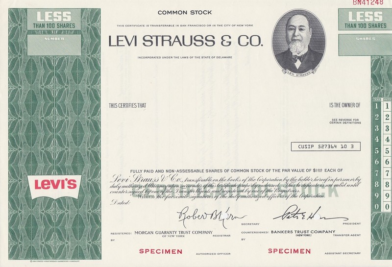 Stock/Bond: Levi Strauss & Co. Specimen Stock Certificate 1970'S Rare Less Than 100 Shares
