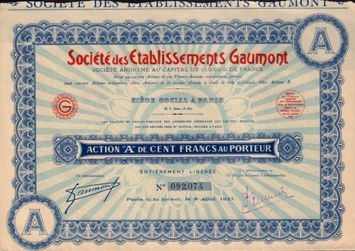 Stock/Bond: Soc. Des Ets Gaumont ( Now Gaumont Franco Film Aubert ) Paris France 1927 Rare