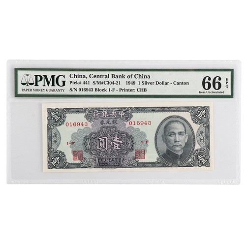 Banknote: 1949 Central Bank Of China 1 Silver Dollar Pick#441 Pmg 66 Epq Gem Unc 1Pcs