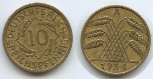 G4794 - Germany Weimar 10 Reichspfennig 1934 A Km#40 Deutsches Reich