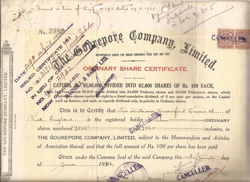 Collecters Item: 1946 India Share: The Gourepore Company Limited Owner Sir William Crawford Kt