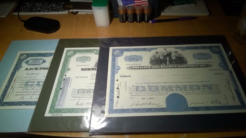 Collecters Item: 4 Old Stock Certificates Van Heusen, Apw Products United Corp & Newmont Mining