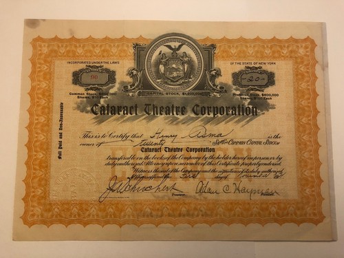 Stock/Bond: 1921 Cataract Theatre Corp. Stock Certificate Historic Niagara Falls Rare Cinema
