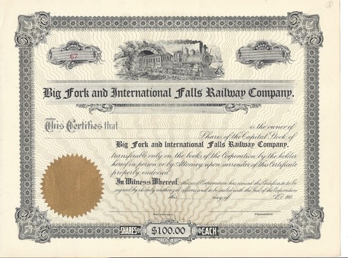 Stock/Bond: Big Fork And International Falls Railway Company...Early 1900'S Unissued Stock
