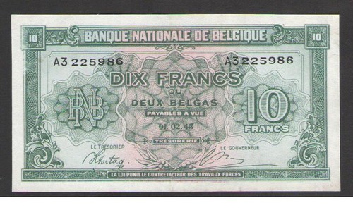 Collecters Item: Belgium 10 Francs 1943 P 122 Circulated = Xf/Au Prefix A3