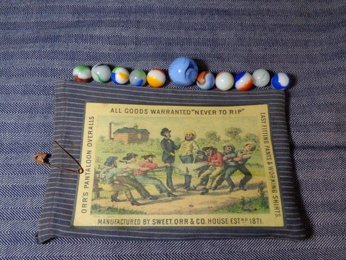Valuable: Country Antique Striped Denim Workwear Bag With Marbles Sweet Orr Ad Farm Kid