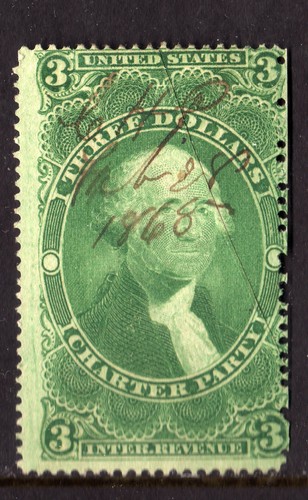 Collecters Item: #080 Us Stamp Scott#R85C $3 Charter Party Pen Cancel Fine