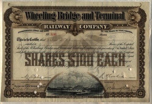 1891 Wheeling Bridge & Terminal Railway Company Stock Certificate West Virginia
