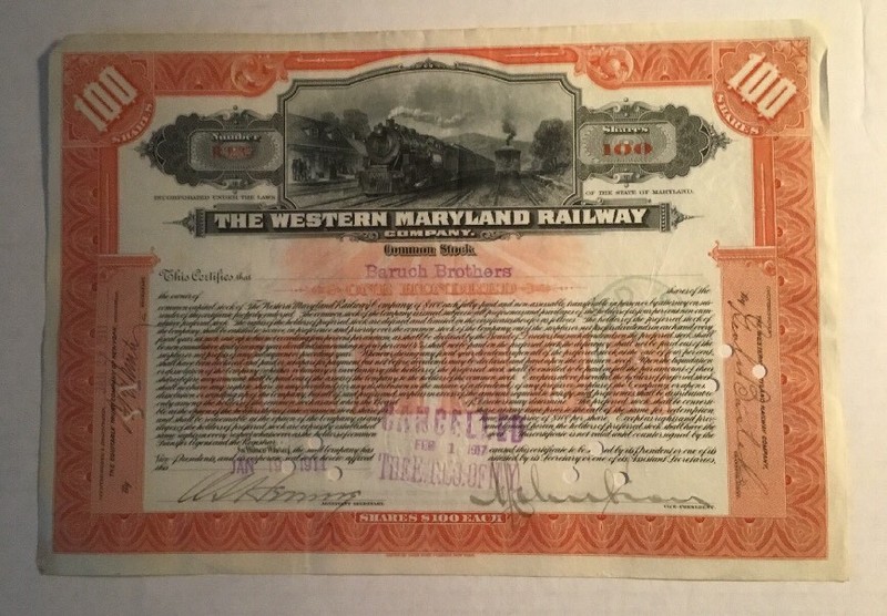 Collecters Item: Western Maryland Company Railroad Stock:Jan 19,1911: Stock No#B3235:Shares 100: