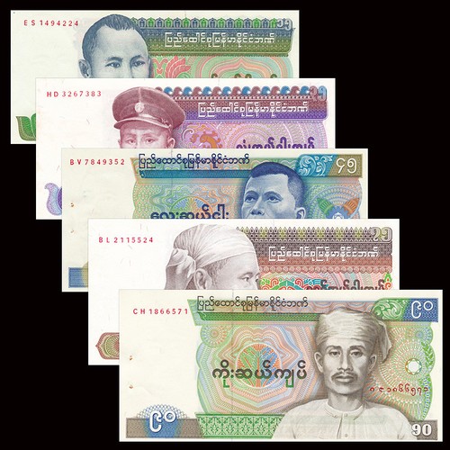 Myanmar Set 5 Pcs, 15 35 45 75 90 Kyats, P-62 63 64 65 66, With Hole, A-Unc