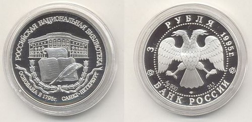Collecters Item: Russia 1995 3 Roubles 1St National Library Of Russia, St. Peterburg Silver Coin