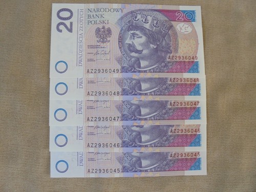 5 X Pcs, Unc. Poland. 20 Zlotych 2016 Consecutive Numbers. Current Banknotes.