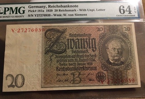 Collecters Item: P-181A 1929 20 Reichsmark, Reichsbanknote, Pmg 64Epq