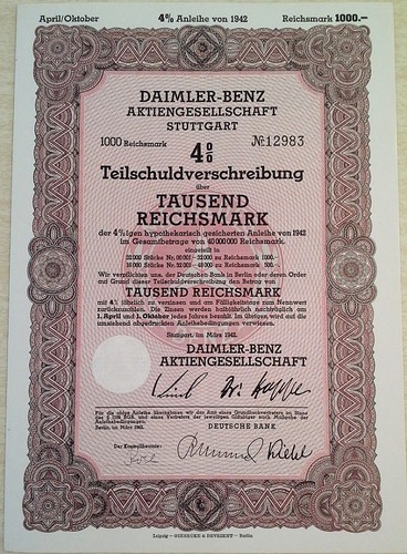 Germany 1942 Daimler Mercedes Benz Auto Car 1000 Reichsmark No Holes Unc Bond Ef