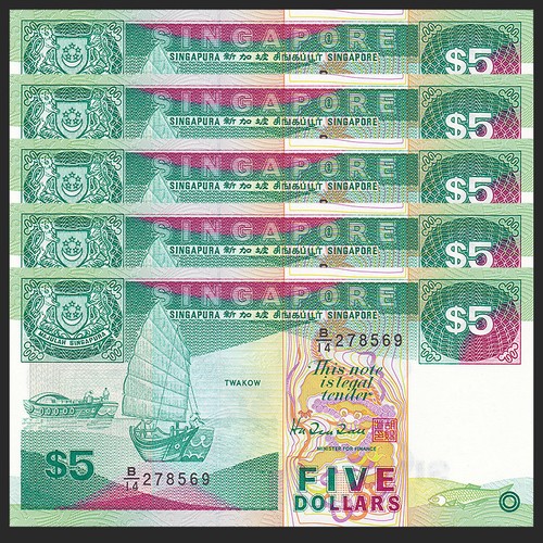 Collecters Item: Lot 5 Pcs, Singapore 5 Dollars, Nd(1997), P-35, Unc
