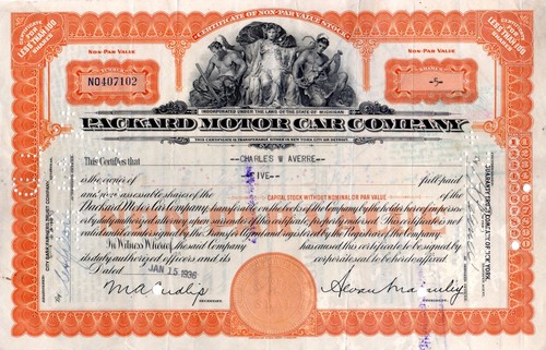 Ten (10) 1936 Packard Motor Car Company of Michigan Stock Certificates -Orange
