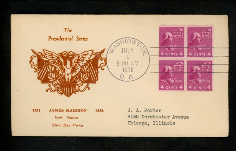 Collecters Item: Us Fdc #808 M#55 Mayne's Cover Service Cachet 4c James Madison 1938 Prexy Prexie