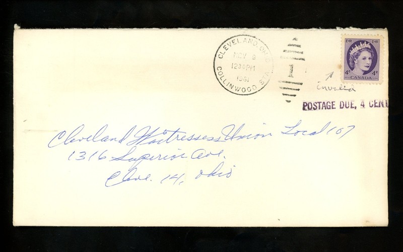 Collecters Item: Us Postal History Canada #340 Improper Use J Due Short Paid 1961 Cleveland Oh