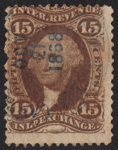 Collecters Item: Us # R40c Used { Double Transfer } 'Oct 21 1868 Cancel' 15c Inland Exchange 1862