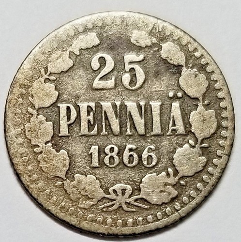 Finland 1866 S Twenty Five Pennia Silver Coin Km #6 Low Mintage Free Shipping