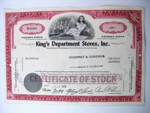 Collecters Item: Kings Department Stores Stock Certificate Bonds Vintage 1965