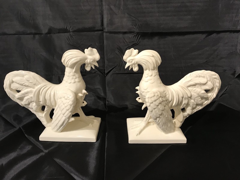 Erphila Rare Antique Pair of Antique Porcelain Czech Large Fighting Roosters