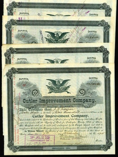 1894 Boston - Cutler Improvement Co - Dealer Lot of 4 Genuine Stock Certificates