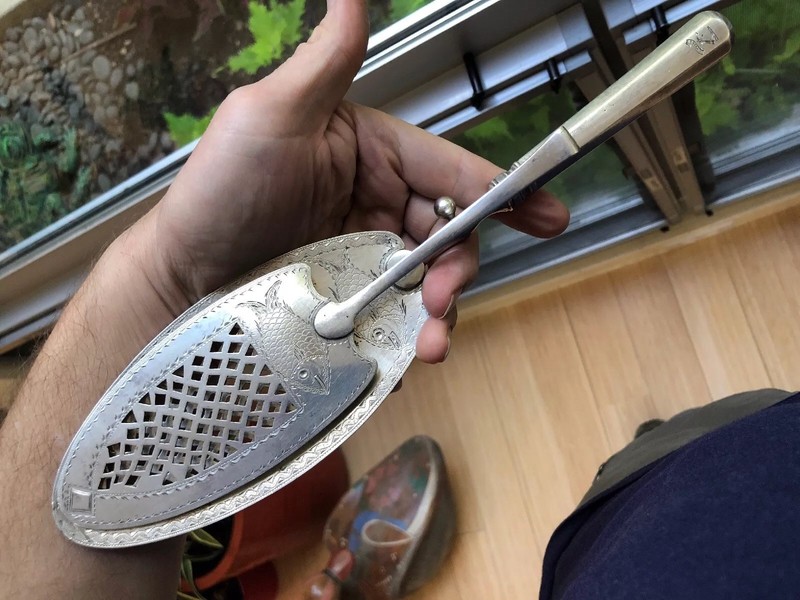 Valuable: Rare Lisbon Portuguese Hinged Sterling Silver Fish Slice Server 1800s
