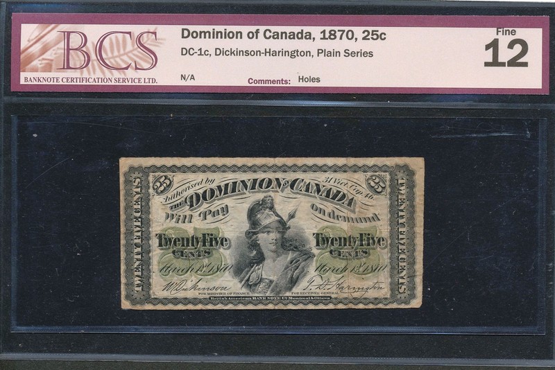 Collecters Item: 1870 25 Cents Dominion of Canada 'Shinplaster'. Bcs Certified F12. Dc-1c