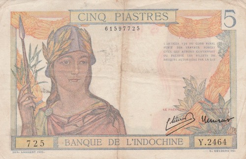 Collecters Item: Ministry of Indochina 5 Cinq Piastres Banknote